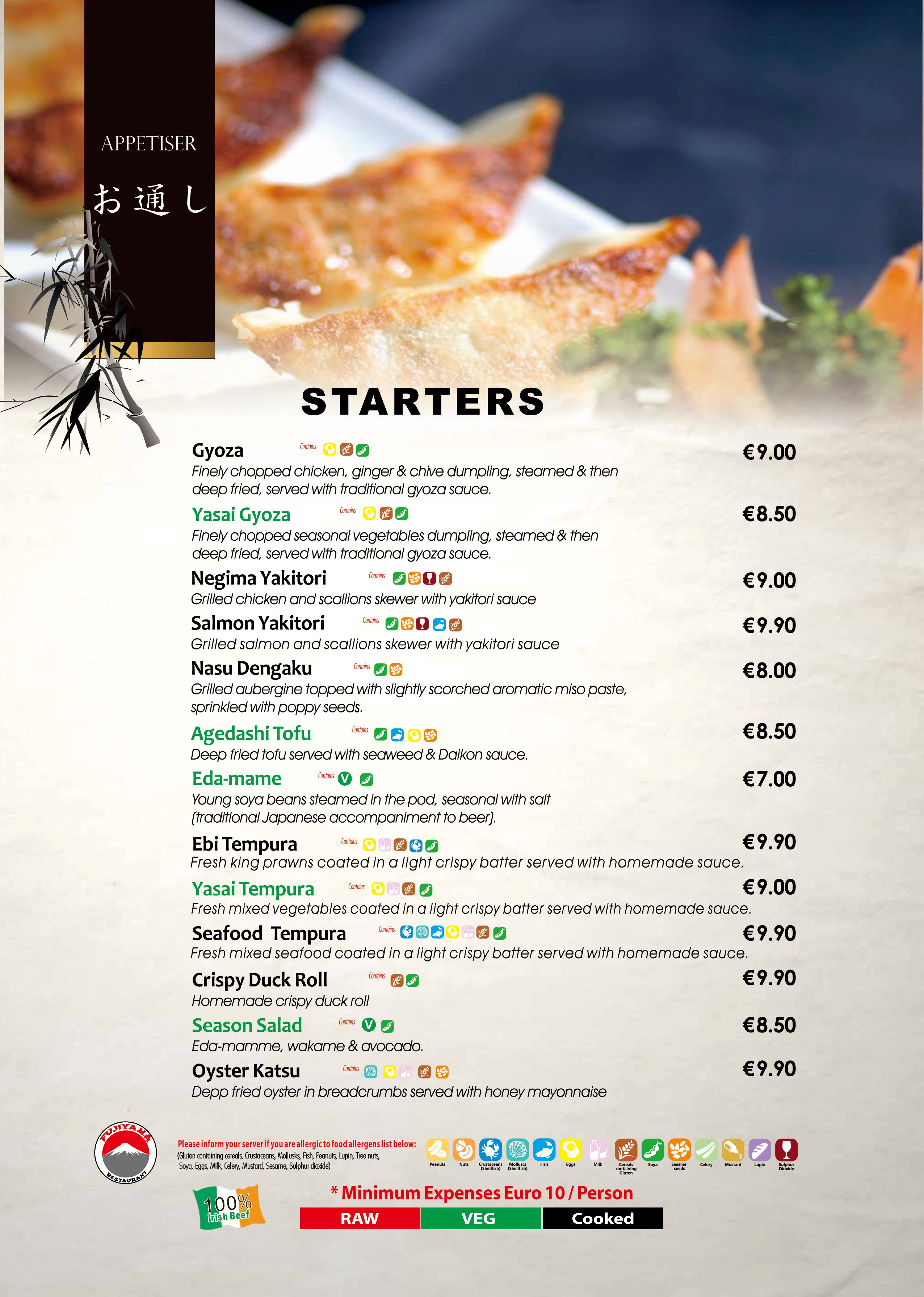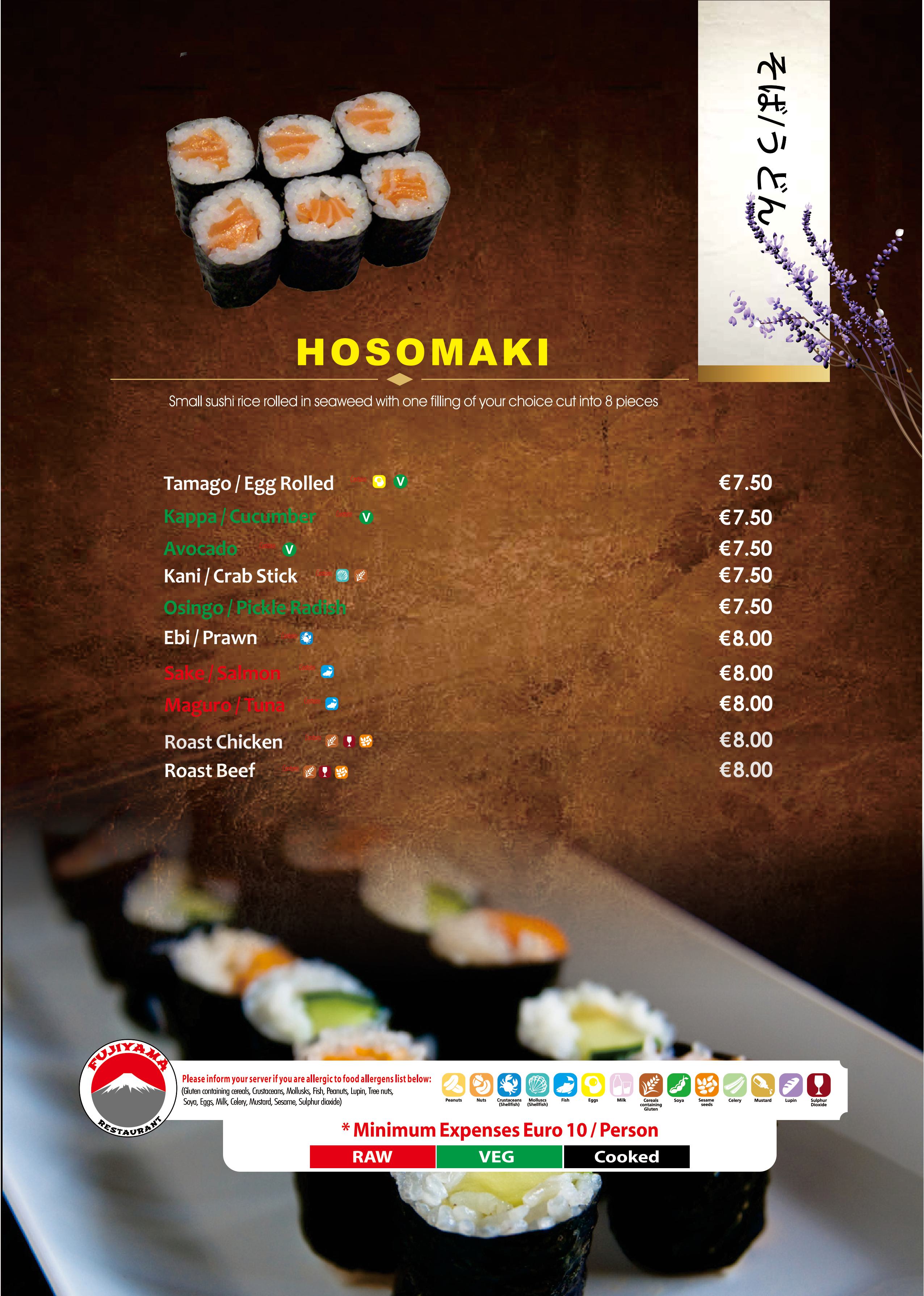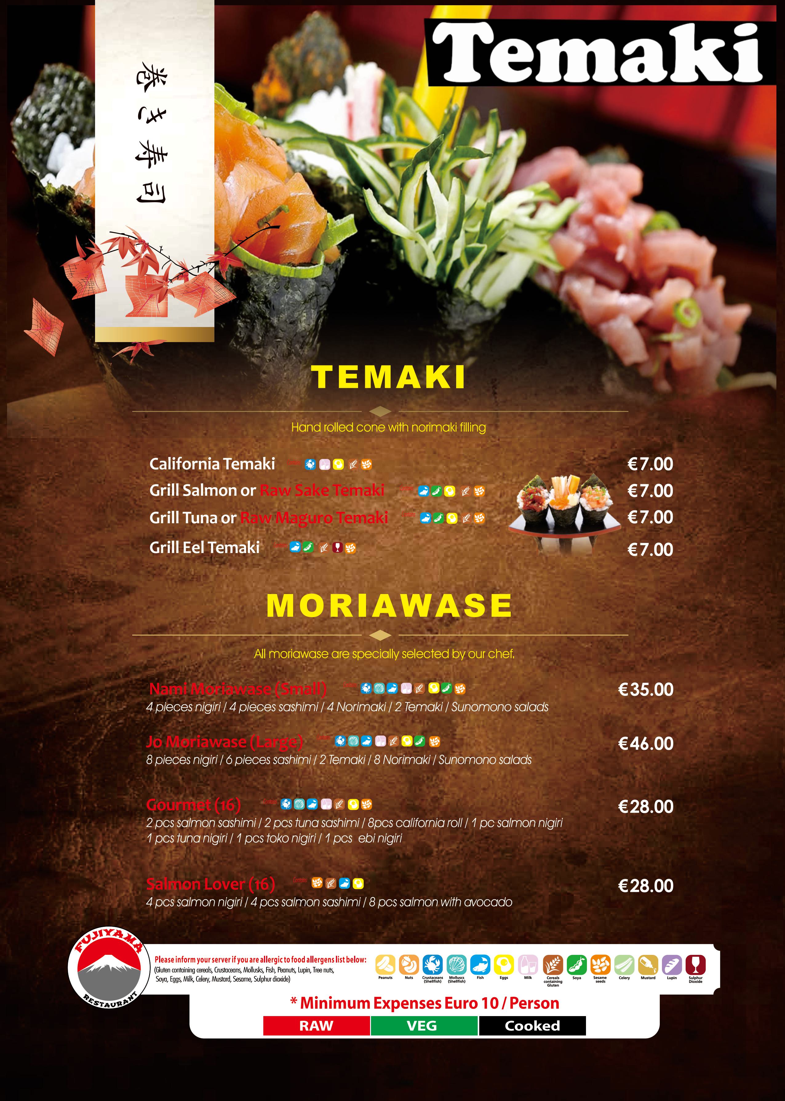 Sashimi are raw slices of fish. Here in Fujiyama our most common Sashimi is Salmon, Tuna.