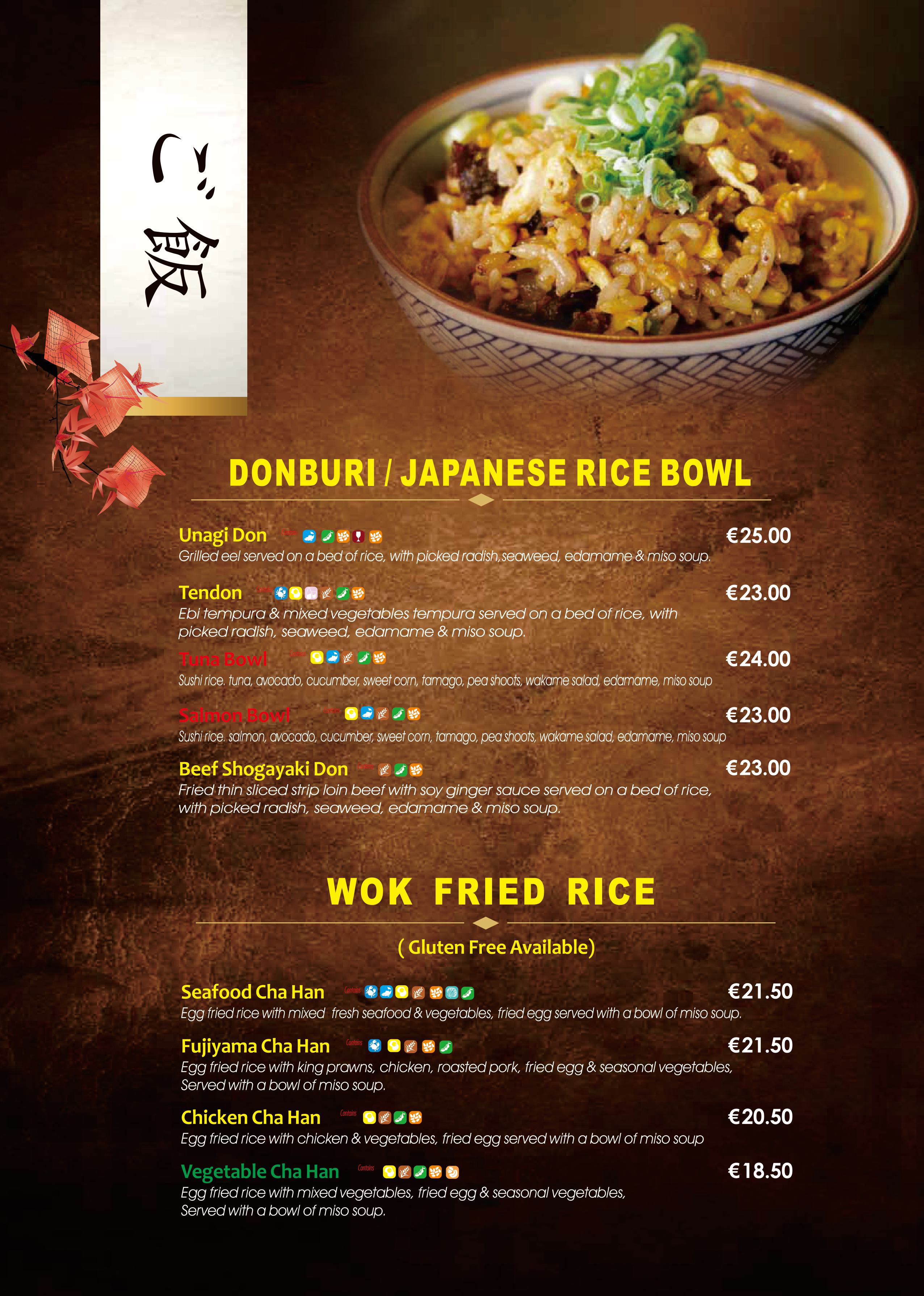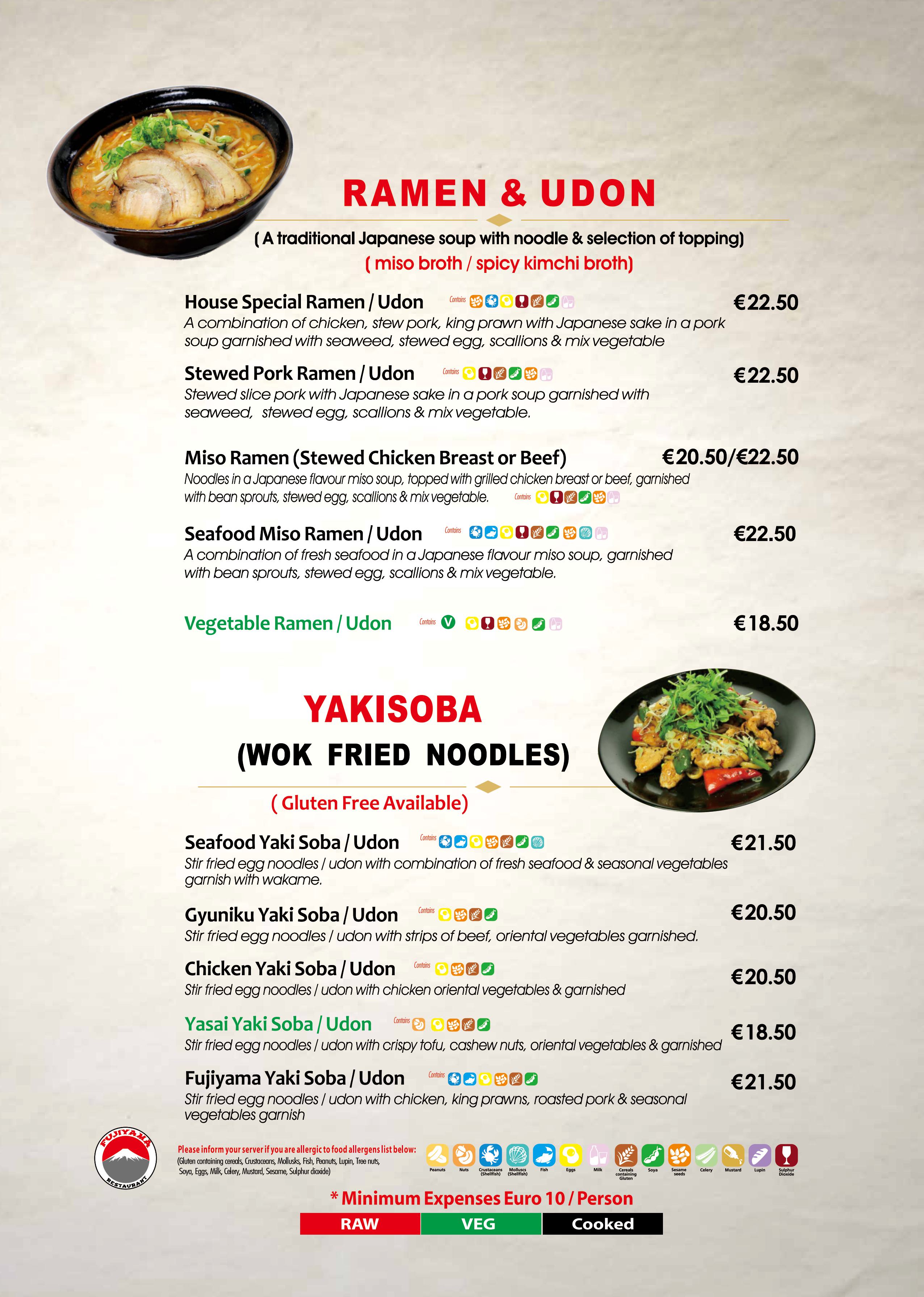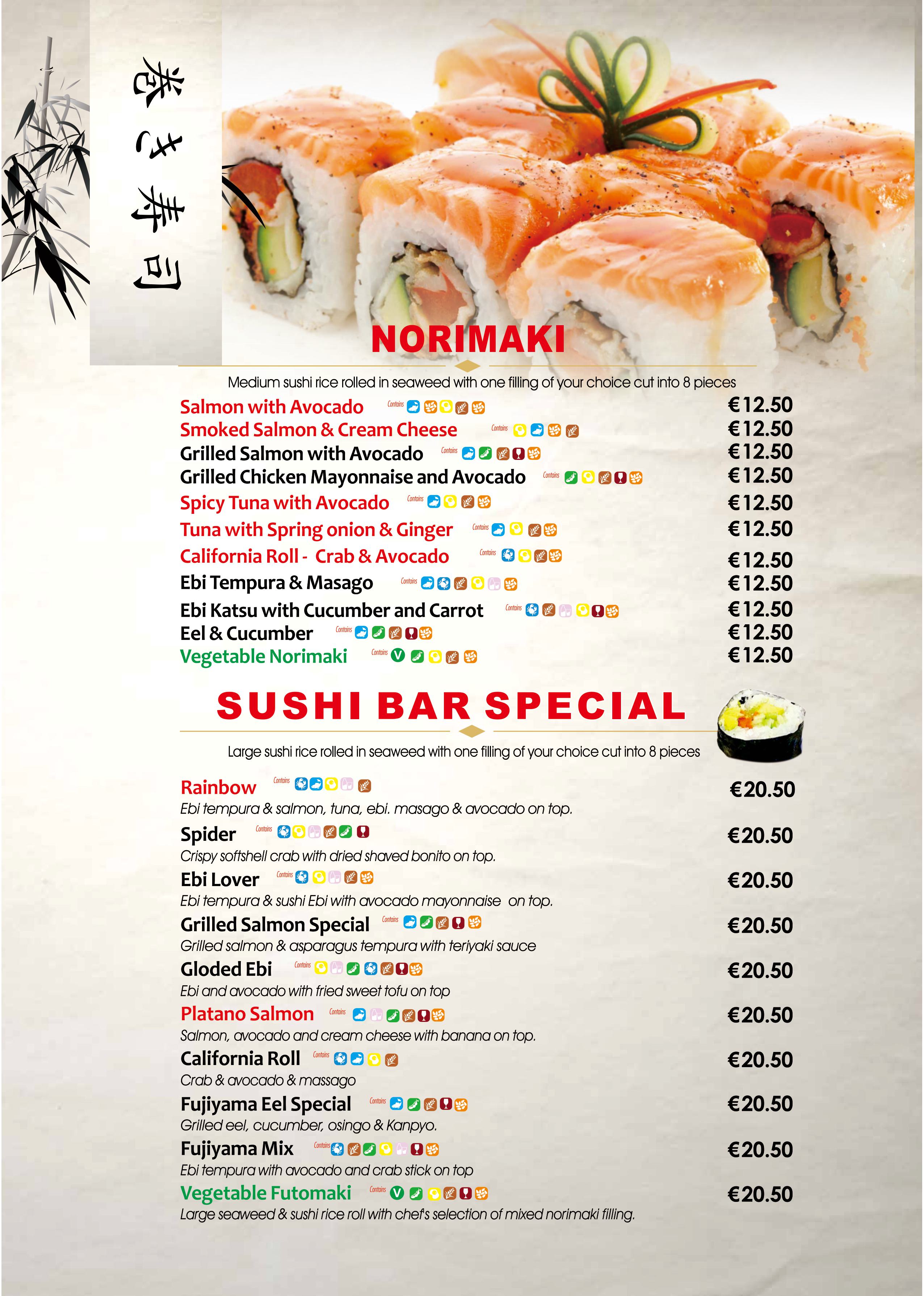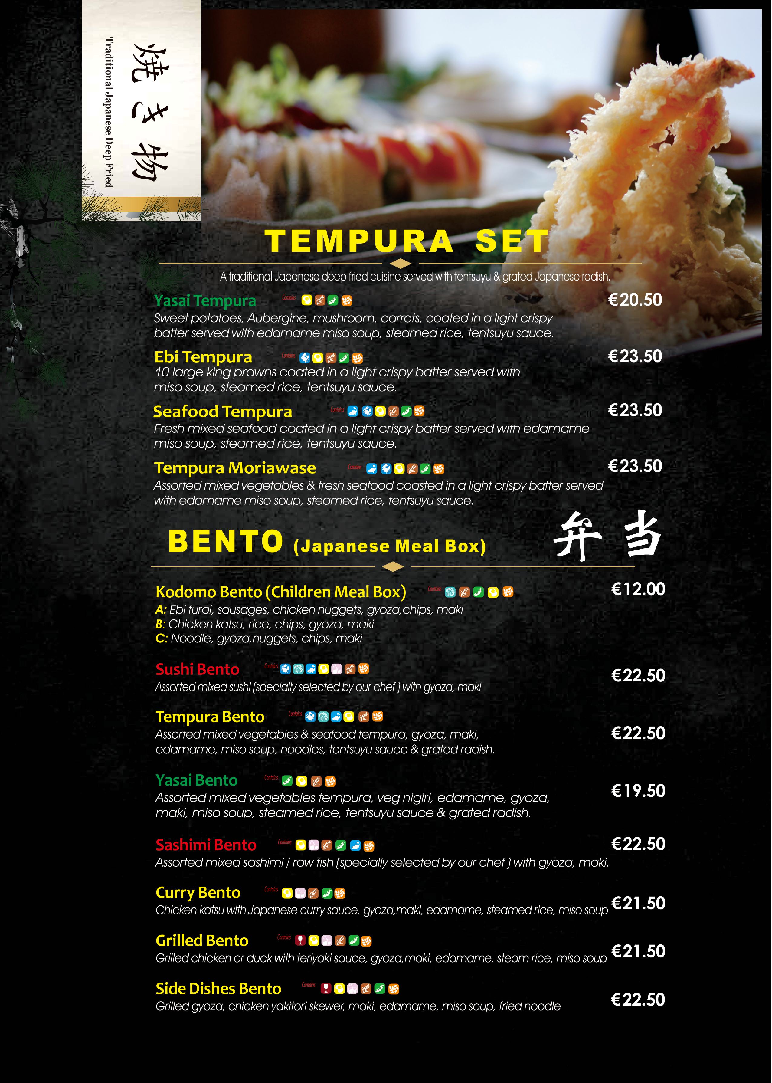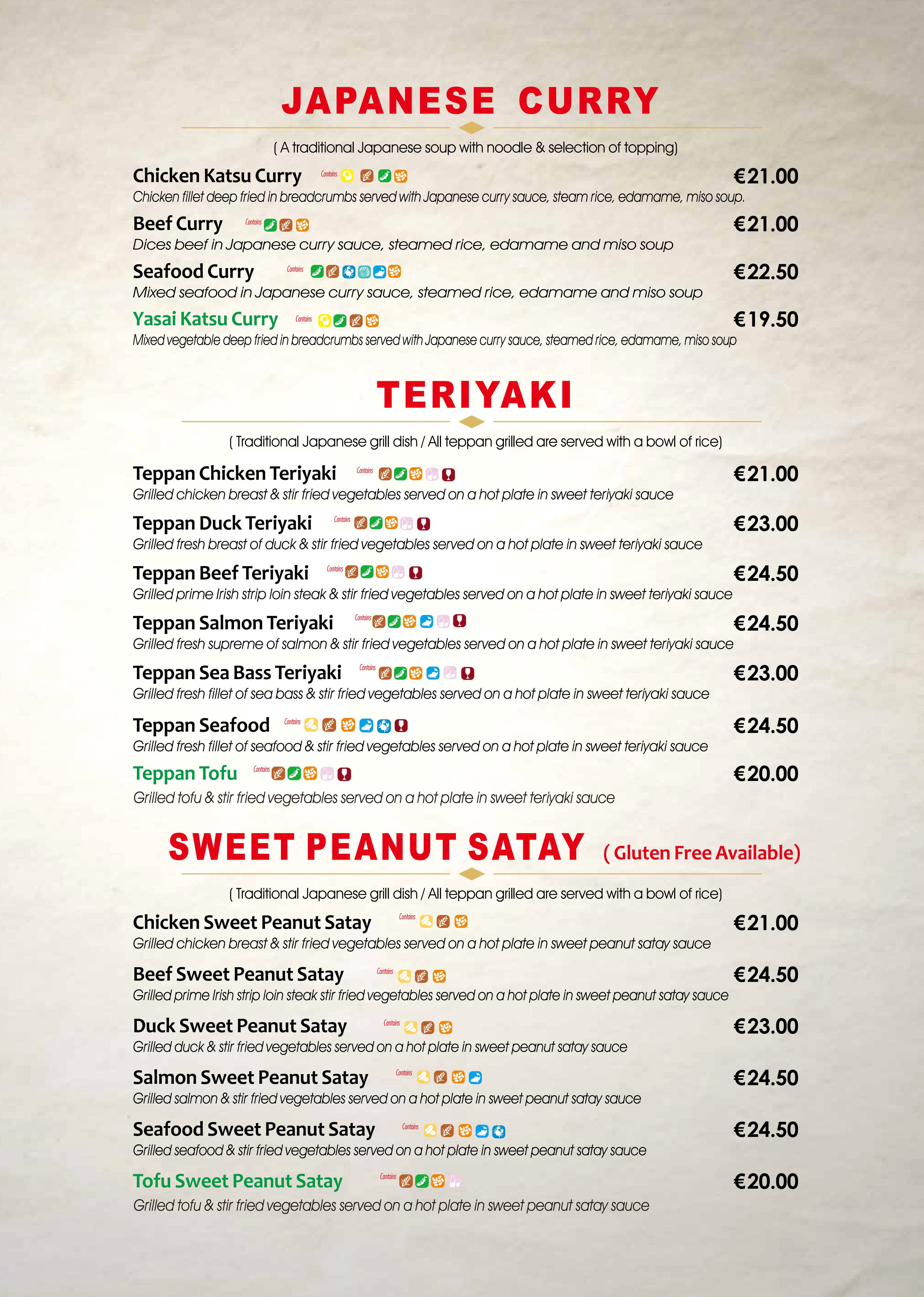 All our food is labeled with our coloured allergens symbols. By placing your mouse on it, it will tell you which allergen it is. Please pay close attention to these allergen symbols before placing the orders. If you need further help with the food allergy,please contact our staff directly.